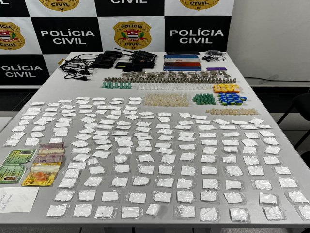 Nesta quarta-feira, 10/12, numa ação conjunta com policiais militares do 55º Batalhão, policiais civis do 4º Distrito Policial deram cumprimento a Mandados de Busca e Apreensão em três locais no Jardim Nova Esperança. Em um deles, os agentes localizaram e apreenderam 32 porções de skunk, 223 de cocaína, 187 de crack e 170 de maconha, todas embaladas individualmente e prontas para o comércio. Também foram apreendidos quatro rádios comunicadores, celulares e R$ 25 em dinheiro. Uma pessoa foi presa em flagrante e encontra-se à disposição da Justiça.