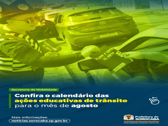 Outras ações programadas para agosto, por exemplo, são: “Seta”, “Teatro – Festa do Trânsito”, “Celular – Blitz”, “Palestra – Educação para o Trânsito”, “Motociclista Seguro – Escola do Motociclista”, “Limite de Velocidade – Blitz”, “Álcool x Direção – Lei Seca”, “Pedale Seguro – Ciclovia”, “Pare, Vai com Calma – Cruzamento Seguro”, entre outros. O calendário completo pode ser conferido nas mídias sociais da Prefeitura de Sorocaba (@prefeituradesorocaba).